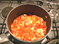 Тушим помидоры с луком и чесноком 5-7 минут, на среднем огне.