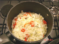 Очищаем перец от семян и мелко нарезаем шалот и чеснок. Все это обжариваем в оливковом масле до легкой румяности. Добавляем тимьян.